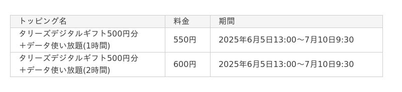 タリーズの「タリーズデジタルギフト(500円分)」と「データ使い放題(1時間)」を550円、「タリーズデジタルギフト(500円分)」と「データ使い放題(2時間)」がセットになったトッピングを600円で提供します。データ使い放題1時間分が実質50円で利用できるおトクなトッピングです。
