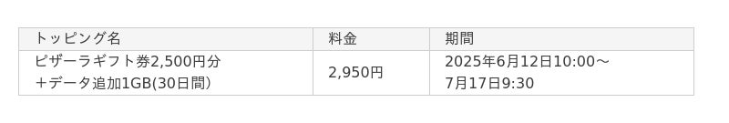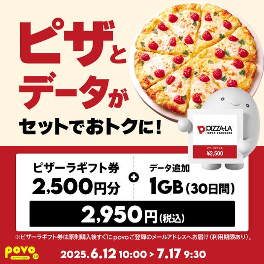 KDDI、沖縄セルラーは2025年6月12日から、povo2.0の期間限定トッピングとして、ピザーラの公式ネット注文で利用可能なピザーラの「ピザーラギフト券(2,500円分)」と「データ追加1GB(30日間)」がセットになったトッピングを2,950円で提供します。