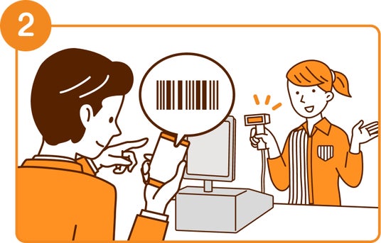 au IDの発行後、画面に入会用バーコードが表示されます。店頭のレジにお持ちいただき、レジのローソンクルーがバーコードを読み取ります。