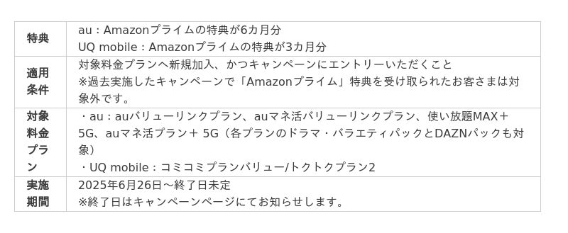 KDDI、沖縄セルラーは2025年6月26日から、auとUQ mobileの対象料金プランへの新規加入で、Amazonプライムの特典が最大6カ月分ついてくるキャンペーンを開催します。