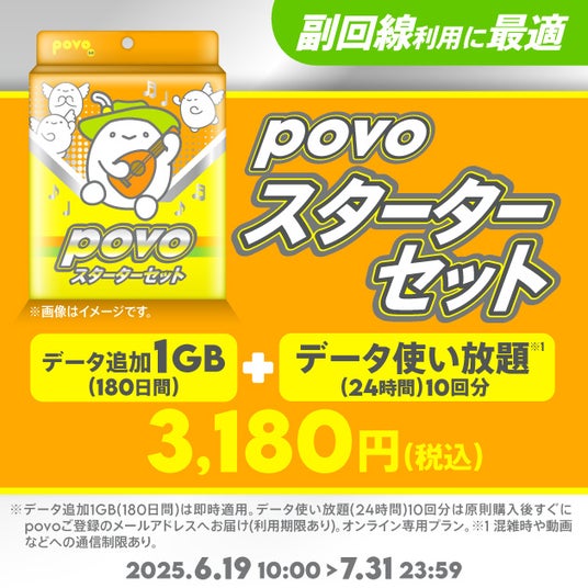 KDDI、沖縄セルラーは2025年6月19日から7月31日まで、povo2.0の期間限定トッピングとして、副回線におすすめのデータ容量がセットになった「povoスターターセット」を3,180円で提供します。
