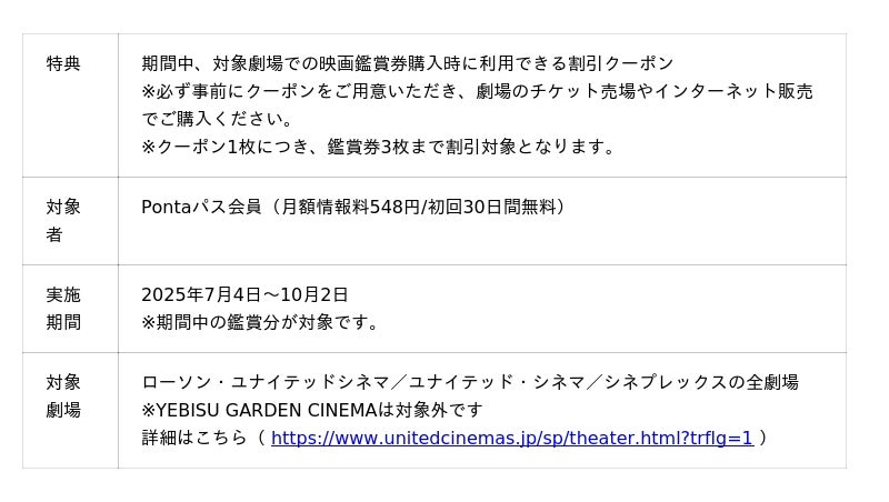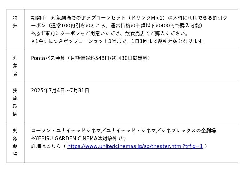 さらに、2025年7月4日から7月31日まで、ローソン・ユナイテッドシネマ グループの劇場でポップコーン1ドリンク(Mサイズ)セットが400円になる特典「半額以下チャレンジ」も提供します。