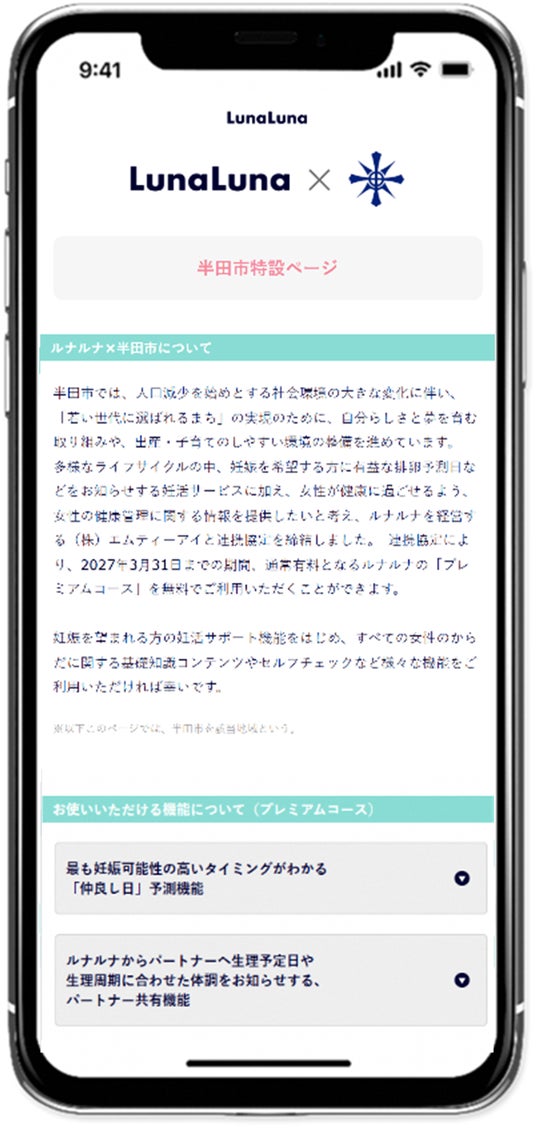 本連携協定により、半田市の住民に対し、すべての女性の一生に寄り添うウィメンズヘルスケアサービス『ルナルナ』の有料機能である「プレミアムコース」の無償提供を開始します。『ルナルナ』のサービスを通じて、不妊治療や妊活に関する基礎知識などの情報配信も予定しており、利用者はライフステージに合わせた健康情報を受け取ることができます。