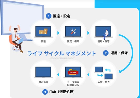 PCの調達から、キッティング、専用の倉庫で保管、必要な時に納品します。故障したり不要になった