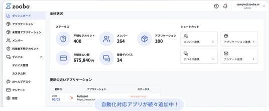 業務委託も含むアカウントの管理、アプリケーションの契約管理、棚卸し機能(特許出願済)、slackと連携したアンケートも取得できます。よって、従業員、アプリケーションの管理台帳として利用できます。連携アプリケーションは100以上です。