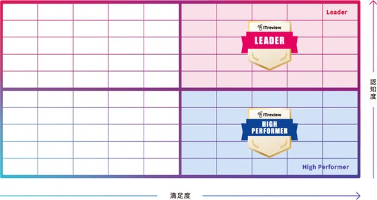 「ITreview Grid」でユーザー評価の高い2領域を表彰し、満足度・認知度両方の領域で高い評価を得たプロダクトには「Leader」バッジが発行され、満足度が高い領域のプロダクトには「High Performer」バッジが発行されます。