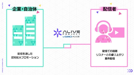 本取り組みでは、『Alive Project byGMOペパボ』の一環として運営している、配信画面デザインサービス「Alive Studio byGMOペパボ」(URL:https://alive-project.com/studio)や、配信者を応援するWebメディア「ストリーマーマガジン byGMOペパボ」(URL:https://alive-project.com/streamer-magazine/)に加え、SNS等の外部ツールを活用し、VTuberやライバー、ストリーマーなど(以下、配信者)と、その視聴者へ、企業・自治体がよりプロモーションしやすい環境を提供いたします。