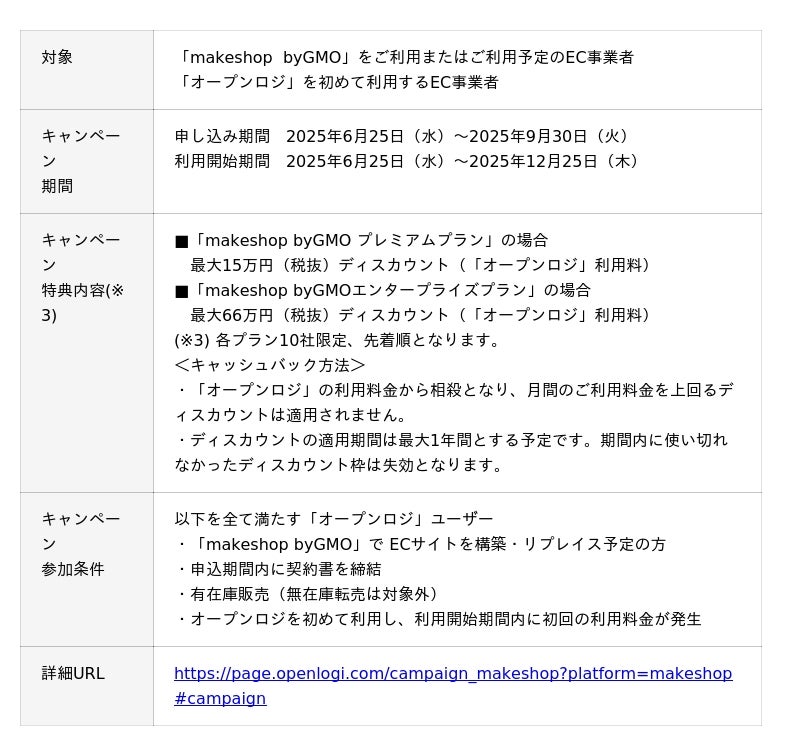 また、本連携を記念して、オープンロジでは「makeshop byGMO連携開始キャンペーン」を実施いたします。