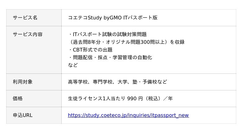本サービスは茨城県立IT未来高等学校やTBC学院、金沢工業大学などの教育機関で導入され、今後もさらなる拡大を予定しています。すでに「コエテコStudy byGMO」をご契約している教育機関では、追加料金により「ITパスポート版」の利用が可能です。