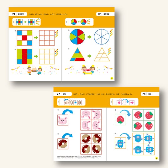 有名小学校の入試に出題されるようなハイレベルな内容ですが、かわいいイラストいっぱいで、シールはりやぬりえなど手を動かして取り組む問題も多いため、最後まで飽きずに楽しくおけいこできます。巻末には、「図形」と「季節」の小学校入試の模擬テストもついています。