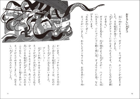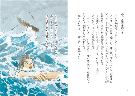 ▲「ロビンソン・クルーソー」より。一文一文が短く、3年生でもひとりで読みきれるようになっています。