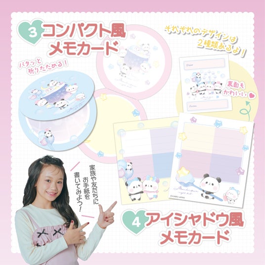 ステショセットは、かわいいもちもちぱんだが目印の『クリアケース』『リップ型ボールペン』『コンパクト風メモカード』『アイシャドウ風メモカード』のゴーカ4点セット!
