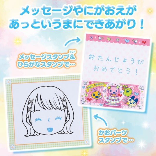 ひらがな50音のほか、メッセージのスタンプや、顔が作れるフェイススタンプがセットで、遊び方いろいろ♪