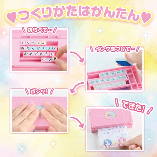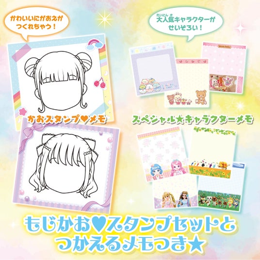 ■スタンプを並べて押すとメッセージやにがおえがプリントできる「もじかお(ハート)スタンプセット」がふろく! 「おてがみひめ」も好評発売中!