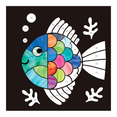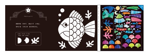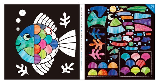 大好評につき、発売後たちまち大重版決定。真っ黒な背景にカラフルなシールをはって、美しいイラストを完成させる新感覚シールパズルです。