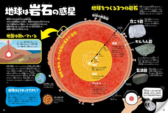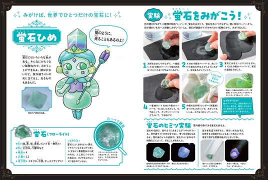 本誌では、キットにつく鉱物の図鑑ページや実験の紹介はもちろん、鉱物ができるまでの地球の歴史を追った記事、うっとりするような美しい宝石の写真など、地球と宇宙の歴史がつまった鉱物の魅力をたっぷり伝えます。