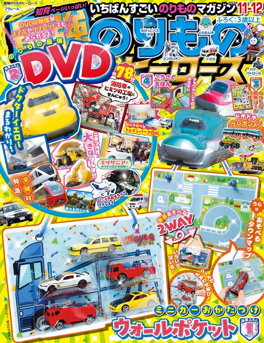 キッズ向けのりもの雑誌『最強のりものヒーローズ11-12月号』は、ミニカーがお片付けできるウォールポケットが付録! 裏面はタウンマップのデザインで遊べる2WAY仕様♪ DVDでは話題のドクターイエローまるわかり特集や、消防車の整備工場などをたっぷり紹介! のりものシール、貨物列車のおはなしが楽しい工作絵本など、もりだくさんの1冊☆