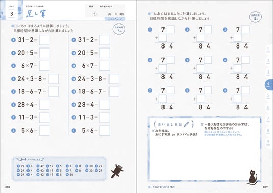 認知力・記憶力・注意力・視空間認知力・情報処理力の5大脳力のうち、情報処理力と記憶力を鍛えると認知機能が上がります。『日記×計算ドリル』を通して、サクサクと手を動かしながら単純な計算や時間やお金の計算を行うことで、情報処理力が鍛えられます。さらに、昔の記憶を思い出しながら日記を書くことで記憶力が刺激され、認知機能がどんどんとアップしていきます。