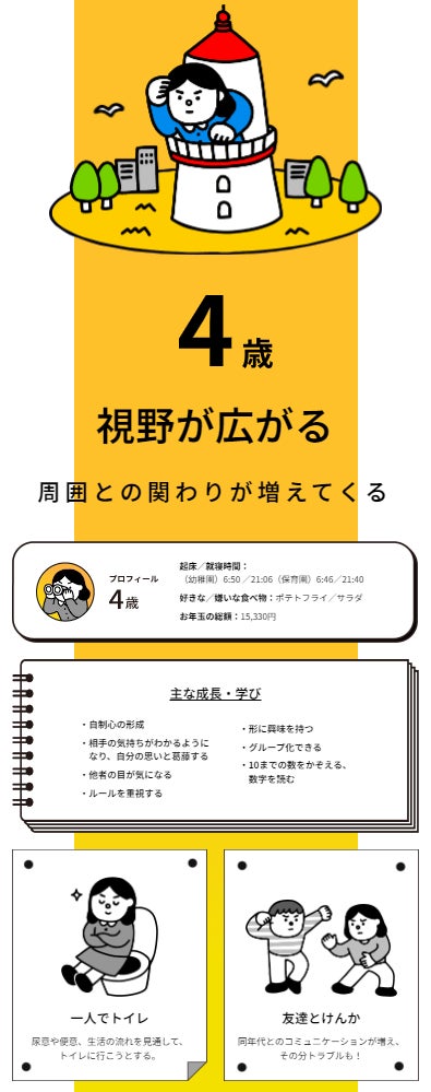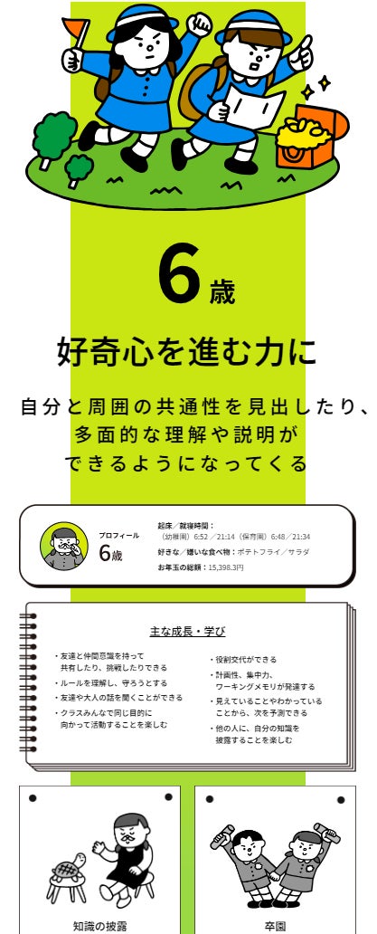 「人の成長過程に大切な要素をユーモラスなイラストとポップなデザインで表現した学びのガイド。年齢や学年に応じて、意識や行動の変化、必要な学習、趣味嗜好などをピックアップ、縦型に配置することで体系的にまとめ、一般には掴みづらい教育情報を親しみやすいデジタルコンテンツとして教育関係者や一般層へ公開したことが貴重」