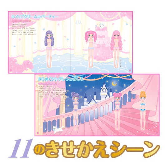 シンデレラのお城や海の中、雪の国など、雰囲気抜群のシーンがきせかえあそびを盛り上げます。