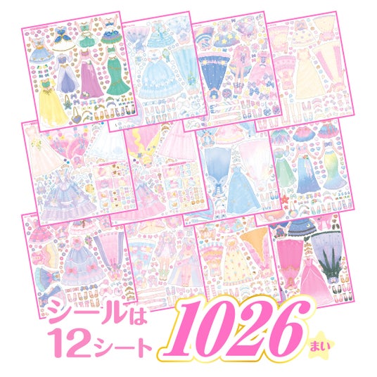 シールは全部で12シート、ドレスシールは100枚。ティアラやくつなどの小物をあわせると、全部で1,026枚のシールできせかえできます。