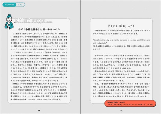 文芸誌「群像」(講談社)での連載からSNSを中心に大きな話題を呼んだ『世界と私のA to Z』(講談社)や、『#Z世代的価値観』(講談社)の著者として知られる竹田ダニエルさん。ジャーナリスト、研究者、雑誌コラムニスト、音楽エージェントと多岐にわたる活躍から、世界の最新動向を敏感に察知し、リアルに発信を続けており、話題を集めています。本書の巻末には、そんな竹田ダニエルさんと、キニマンス塚本ニキの英語対談を収録! 本書で取り上げられている5つのトピックについて、英語で語り合っています。自然なスピードで話されるナチュラルな英語を繰り返し聞いて、英語の学習をするとともに、トピックに関する学びを深めていきましょう。