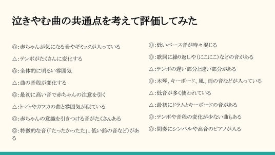 「パソコン×自由研究コンテスト2024」の小学生の部最優秀賞は、0歳の弟が泣き止む曲の共通点を分析してオリジナルの「赤ちゃんが泣き止む曲」を作った研究です。課題の設定から分析、仮説と検証など一連の過程を論理的に進めているほか、生成AIという最新ツールを上手も活用しています。何よりみんなを笑顔にする作品です。