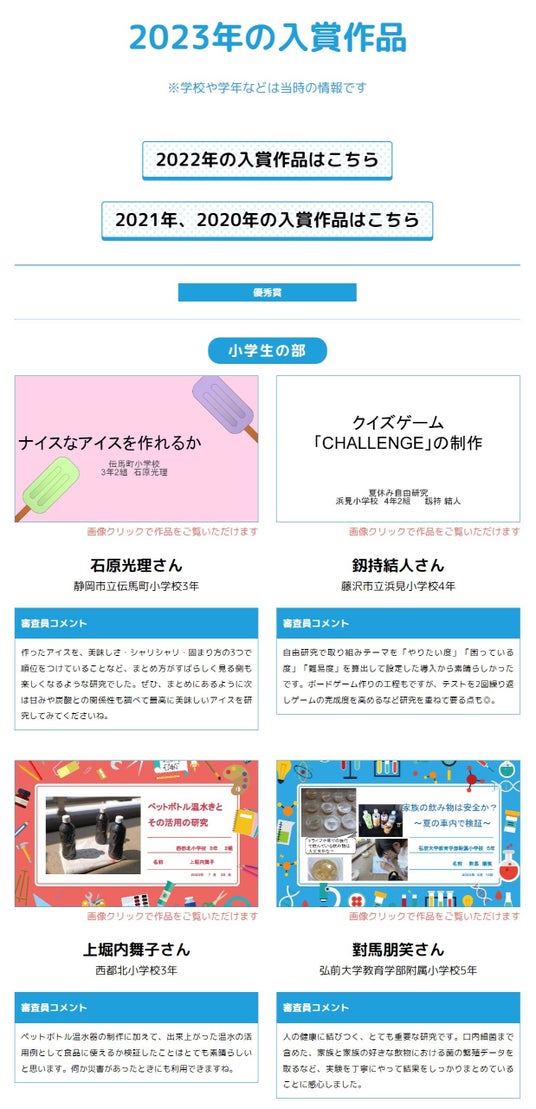 特設サイトでは、最優秀賞作品のほか、丁寧な実験と結果の分析、コンパクトにポイントを押さえたまとめ方が光る作品など今回の入賞作品8点、昨年の最優秀作品2点も掲載。加えて、特設ページからは、2020~2023年度の歴代入賞作品も紹介しています。いずれも、子どもたちと自由研究の大きな可能性がうかがえる作品です。入賞作品を広く公開することで、子どもたちに課題を見つけて研究・探究する楽しさや今後のさらなる自由研究の取り組みへとつながることを期待しています。