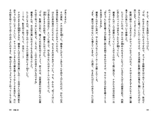主人公のナホは、裁縫が好きな女の子。もうすぐ生まれる弟に会える日を心待ちにしています。そんなある日、お母さんの定期検診のためについていった病院で、「影縫い体験会のお知らせ」というチラシが貼られているのを見つけます。「生まれたばかりの赤ちゃんに影を縫う影縫い師の仕事を、あなたも体験してみませんか?」というふしぎな文面に興味をひかれたナホは、体験会に参加し、ベテランの「影縫い師」である鍋島さんに出会います。