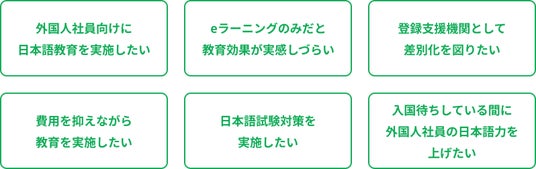 『N4レベル~スタート』『来日直後から早期に日本生活に慣れる』『仕事の中でのコミュニケーション力の強化』など、特定技能外国人が職場に定着、活躍することを目指します。