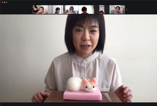 ▲「かわいい感性デザイン賞 優秀賞」受賞記念『羊毛フェルト材料用具つき ふわふわ みつごのにゃんころキット』を使った午前のオンライン講習会の様子。はっとりみどり先生。