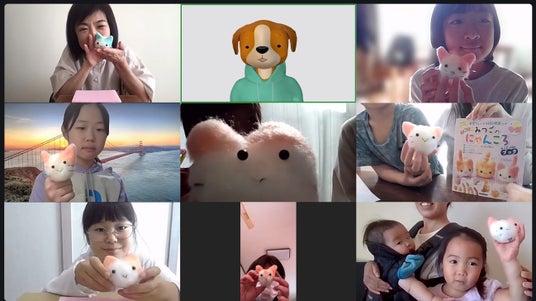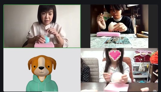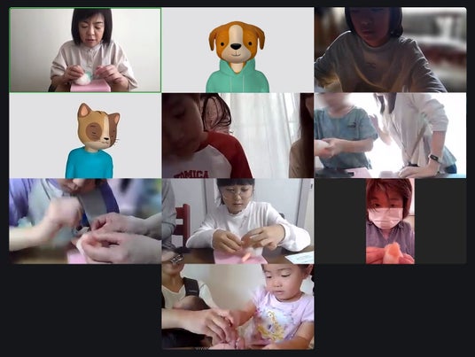 ▲午前のオンライン講習会の様子。小さなお子さんはお母さんのお手伝いもありつつ、楽しそうに作っています。犬は司会者、猫はスタッフのアバターです。