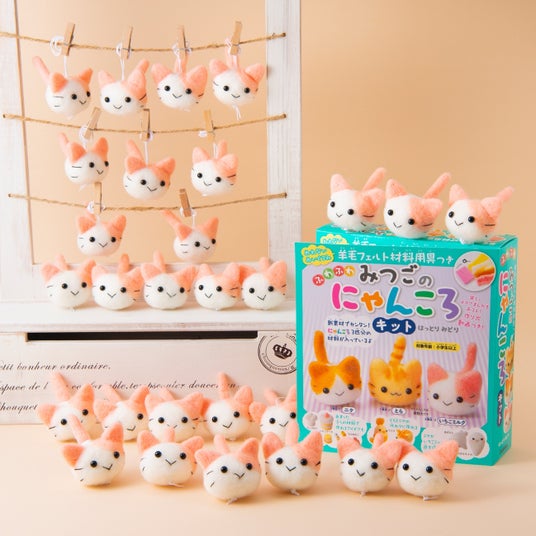 ▲「かわいい感性デザイン賞 優秀賞」受賞『羊毛フェルト材料用具つき ふわふわ みつごのにゃんころキット』。ピンクと白のかわいい子猫たちは、パッケージ写真右端の「いちごミルク」制作例。(※キット1箱の材料で作成できるのは3個程度です)