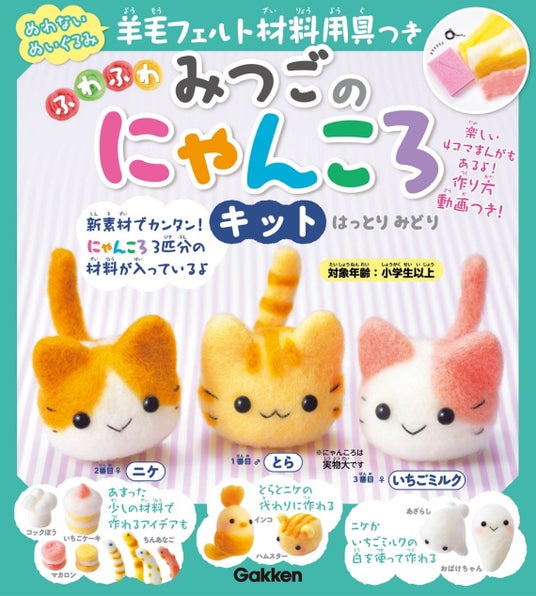 「羊毛フェルト手芸」の材料キットは従来からありましたが、針を使うため、「16歳以上」という商品が多い中、子ども向け企画として本書が登場。それは「手を動かして何かを生み出す、手芸の楽しさを、子どもたちにもっと広げたい」という著者と編集者の願いから実現しました。まずは、子どもたちに興味を持ってもらうため、かわいくて、簡単に作れるキャラクター・にゃんころを、はっとりみどりさんが考案、3匹の子猫の材料で、他にも「いちごケーキ」「マカロン」「ちんあなご」「ハムスター」など、小学生が大好きなお菓子や動物を作成できるようにしました。