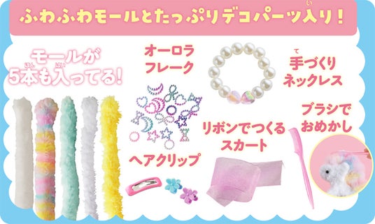 キットには、ヘアクリップやオーロラフレークなど、ゆめかわなデコパーツがたっぷり入っています。パールを組み合わせてキラキラのネックレスを作ったり、リボンでスカートを作ったり、アイデア次第でおしゃれを楽しむことができます。