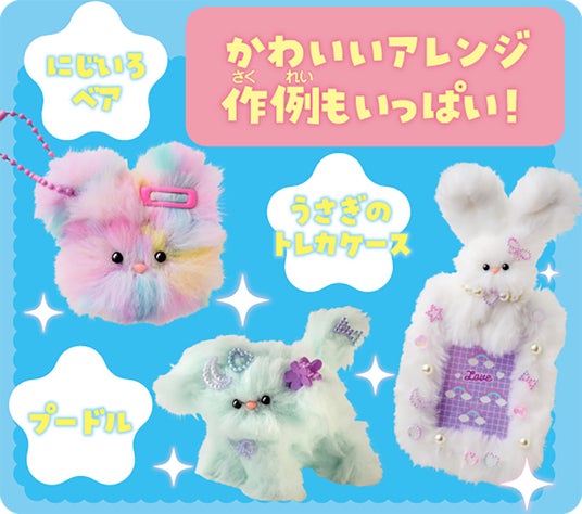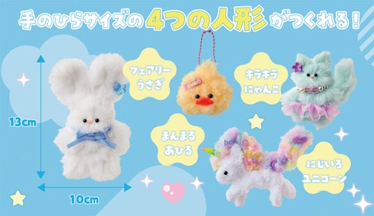 必要なものは全部入り! キットひとつで 「うさぎ」「ユニコーン」「ねこ」「あひる」の4つのもふかわドールが簡単に作れます♪ 付属のミニチュアブラシでかわいくおめかししたら、お気に入りのドールと一緒にお出かけしたくなること間違いなし!