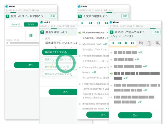 理解度問題を解くだけでなく、リスニング力もスピーキング力も同時に鍛えるオーバーラッピングの練習もメニューに組み込まれています。音声スピードを選ぶことができ、オーバーラッピングのやり方も丁寧に説明されているので、英語学習が初めての方でも安心です。