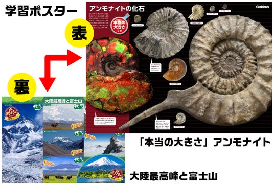 付属するDVD以外にも豪華特典が付きます。B3サイズの学習ポスターは両面使える仕様。表面は、大小さまざまなアンモナイトの化石を「本当の大きさ」で掲載。特に直径30cmを超える種の写真は圧巻です。裏面には、世界6大陸それぞれの最高峰の山々と日本一高い富士山の美しい写真を掲載しています。