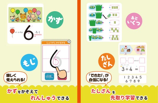 「数」の学習は3歳から、「たし算」の学習は4歳からご用意。段階的に6歳まで取り組めるので、小学校での算数の学習の準備や先取りにもぴったりです。