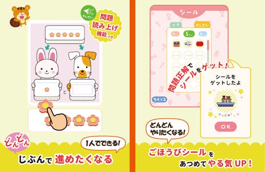 問題を正解するごとにもらえるごほうびシールは、「できた!」という充実感を高め、「もっとやりたい!」という気持ちを引き出します。