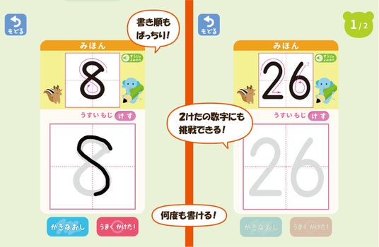 1~0までの1けたを練習したあとは、2けたの数字の練習も。1けたよりもちょっと細く書く…など、バランスを考えて書く力も自然に養えます。