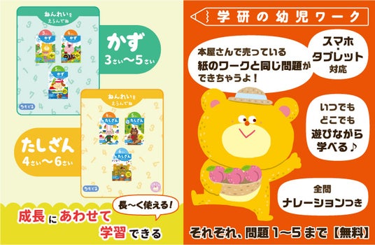 全国書店で発売中の「学研の幼児ワーク」シリーズから、さんすうワーク6冊をそのままアプリ化。タブレットやスマホで気軽にお勉強できるようになりました!