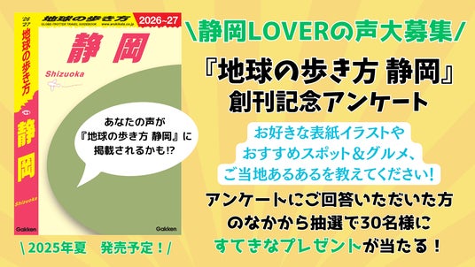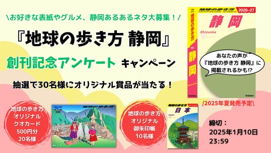 『地球の歩き方 静岡』の制作決定を記念し、2024年12月9日より創刊記念アンケート&プレゼントキャンぺーンがスタート。『地球の歩き方 静岡』の表紙を飾るイラストやおすすめスポット&グルメ、ご当地あるあるネタなどについて、静岡県民をはじめ、静岡にゆかりのある方の生の声を大募集しています。お寄せいただいた貴重なご意見や体験談が『地球の歩き方 静岡』に掲載されるかも! またさらにアンケートにお答えいただいた方の中から抽選で30名様に、地球の歩き方オリジナルクオカードなどのプレゼントが当たります。(締切:2025年1月10日)