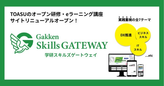 学研グループにおいて社会人教育領域の中核を担う株式会社TOASUは、2023年12月よりフレキシブルな学習形態を求めるお客様の声にお応えするため、ECサイト「TOASU BASE」を開設し運営してまいりました。このたび、学研グループの学びのサービスを集結させたプラットフォームを構築することを目的とし、「TOASU BASE」から「Gakken Skills GATEWAY」へ名称を変更し、リニューアルいたしました。さらに、「生成AI」をテーマにしたオープン研修(1名から参加可能な公開型講座)など9講座を新たに開講いたしました。今後は、学研の社会人向け教育サービスも拡充して、さらにご満足いただけるサイトを構築してまいります。