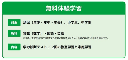 - 内容 学力診断テスト / 2回の教室学習と家庭学習