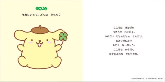 対象は3歳~。サンリオキャラクター・ポムポムプリンと一緒に、幸せに生きるための支えとなる感情「うれしい」について知り、気持ちを共有するよろこびや伝える大切さを学ぶ絵本です。