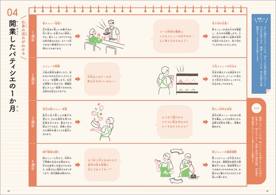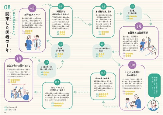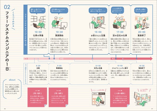 マンガのあとは各職種「1日」「1か月」「1年」の働き方を豊富なイラストとともにくわしく解説。