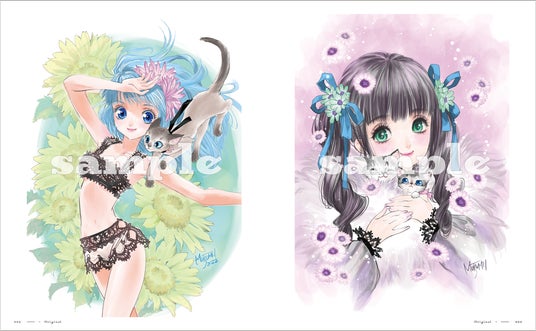 画集の扉をあけると、まず目に飛び込む左ページの猫と少女は、亡くなった年にデジタルで描かれた「ねこ展~ねこ・猫・ネコ アート&グッズフェア~(以下、「ねこ展」)」ノベルティ用の特製サイン色紙イラスト(2024年)、右ページには、同じ「ねこ展」特製サイン色紙イラスト(2022年)を掲載。巻頭は、いのまたむつみさんが愛を注いで描き続けた猫と美少女が満載です。