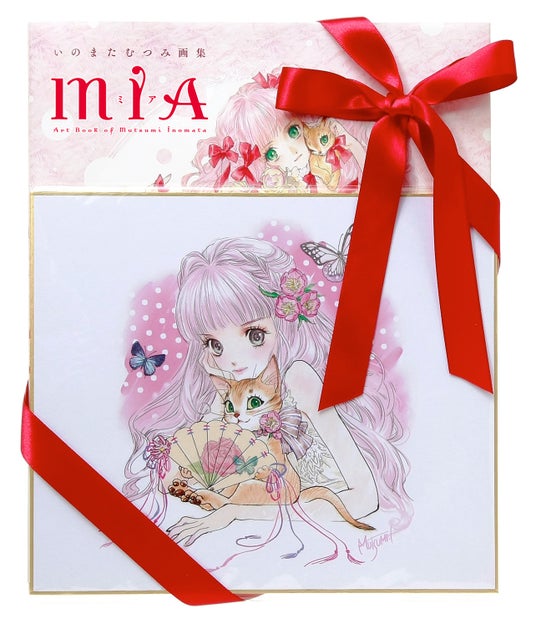 『MIA』の発売を記念して、「かなプロβ」で、画集に特製色紙をつけたセットを【限定版】として販売します。さらに、表紙の少女の髪や手に絡まるリボンをイメージした、赤いリボンを掛けてお届けいたします。4月15日より予約を開始していますので、「いのまたむつみMIA(ミア)」コーナーをぜひご覧ください。
