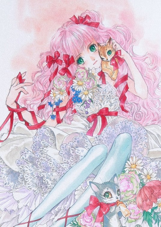 そんなファンのために、新たに編集されたものとしては没後初となる画集『MIA』が、6月26日に上梓されることになりました。いのまたむつみさんが愛を注ぎ続けた猫と少女のオリジナルイラストを中心に、今回画集初登場の、比較的新しい年代に描かれたオリジナル作品、版権作品、最後の最後まで手掛けていた作品やラフ、既刊画集に掲載されていても何度でも見たいと思う人気の高いイラストの再録まで、いのまたむつみさんの魅力や歴史、人柄をたどるような絵を集めました。
